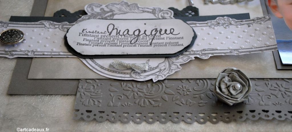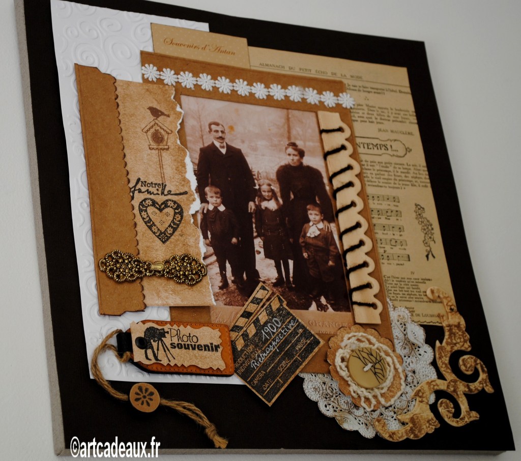 Ou un tableau montage de plusieurs photos de famille avec des décors de papiers tamponnés, gaufrés, encrés, découpés et, selon les goûts, des ajouts de perles, rubans, boutons…