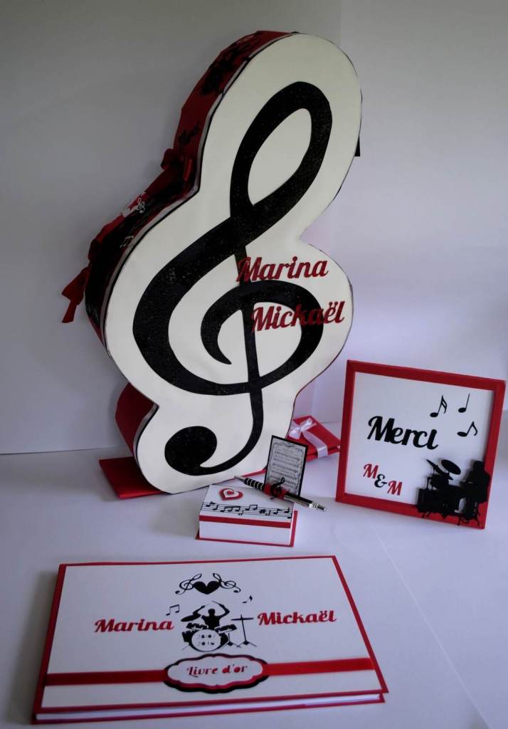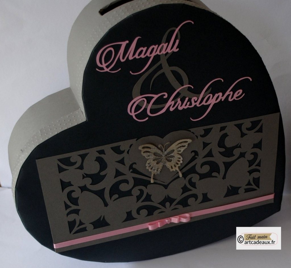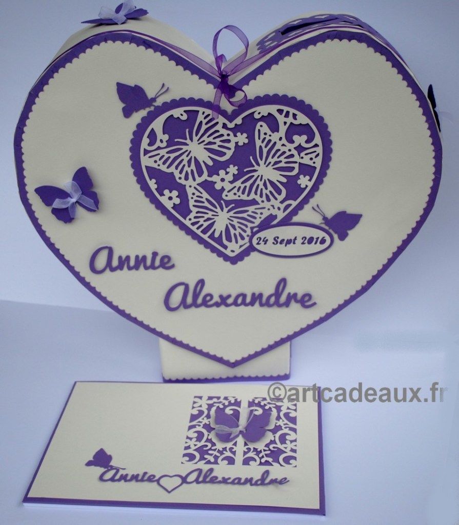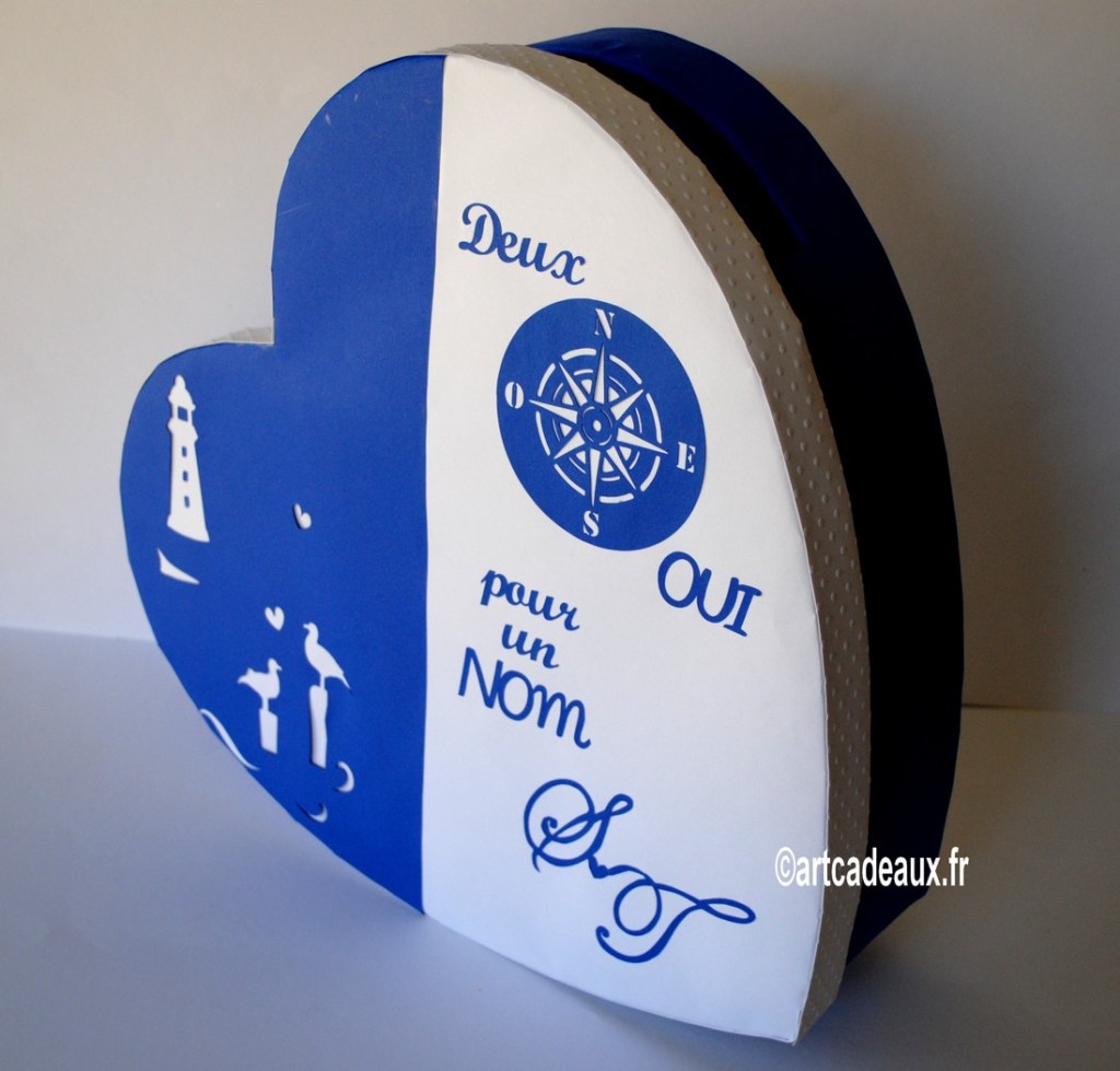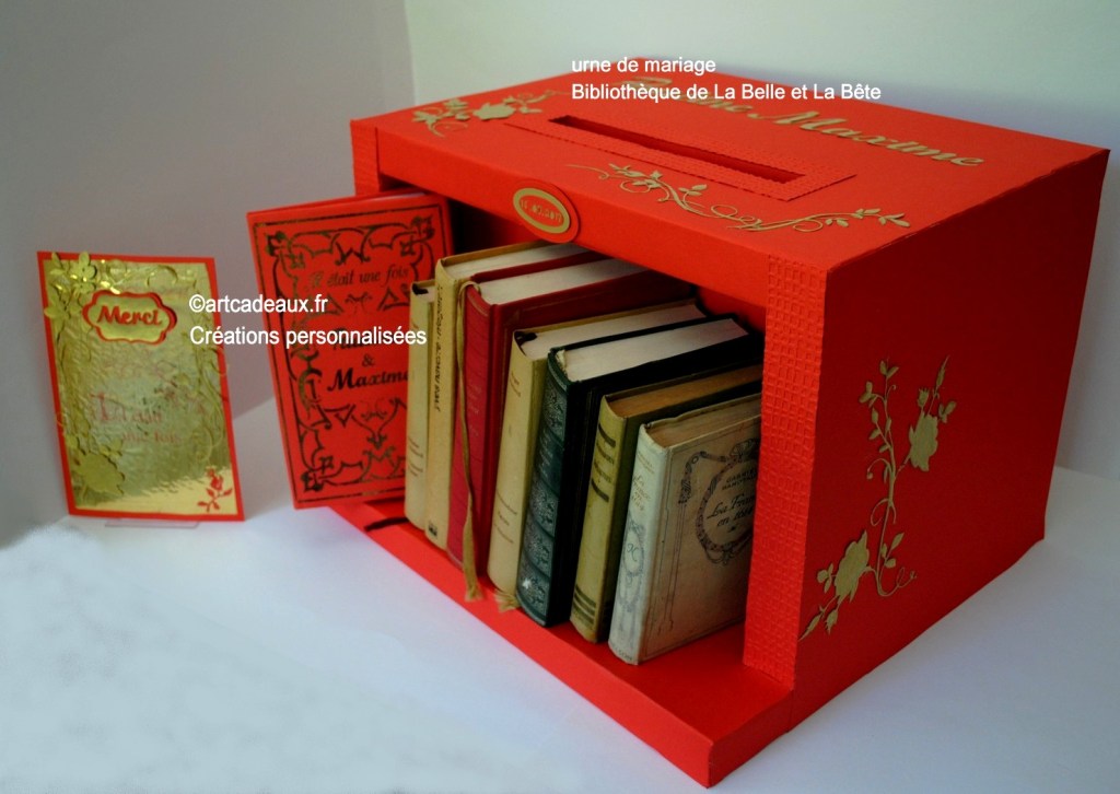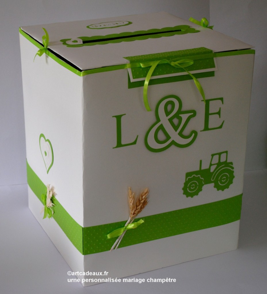 Pour que l’harmonie de votre décoration de salle soit parfaite, créons votre urne à enveloppes dans le thème de votre faire-part et de votre livre d’or.